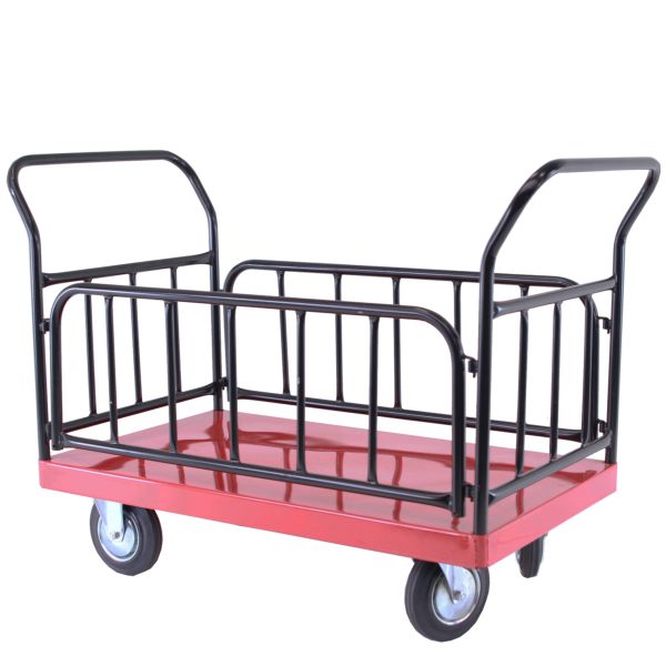 FB505A je plošinový skladový vozík vybavený dvoma pevnými čelami a dvoma bočnými koľajnicami. Čelo aj bočné boxy sú v prípade potreby ľahko odnímateľné.